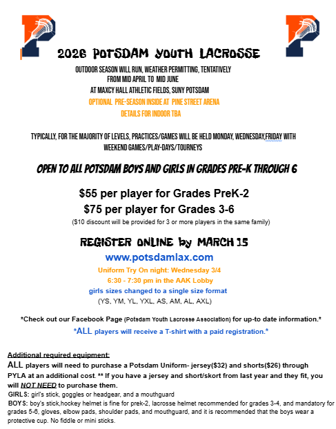 We are excited for the 2026 Season! Please continue to check our webpage: www.potsdamlax.com or our Facebook page for updates.